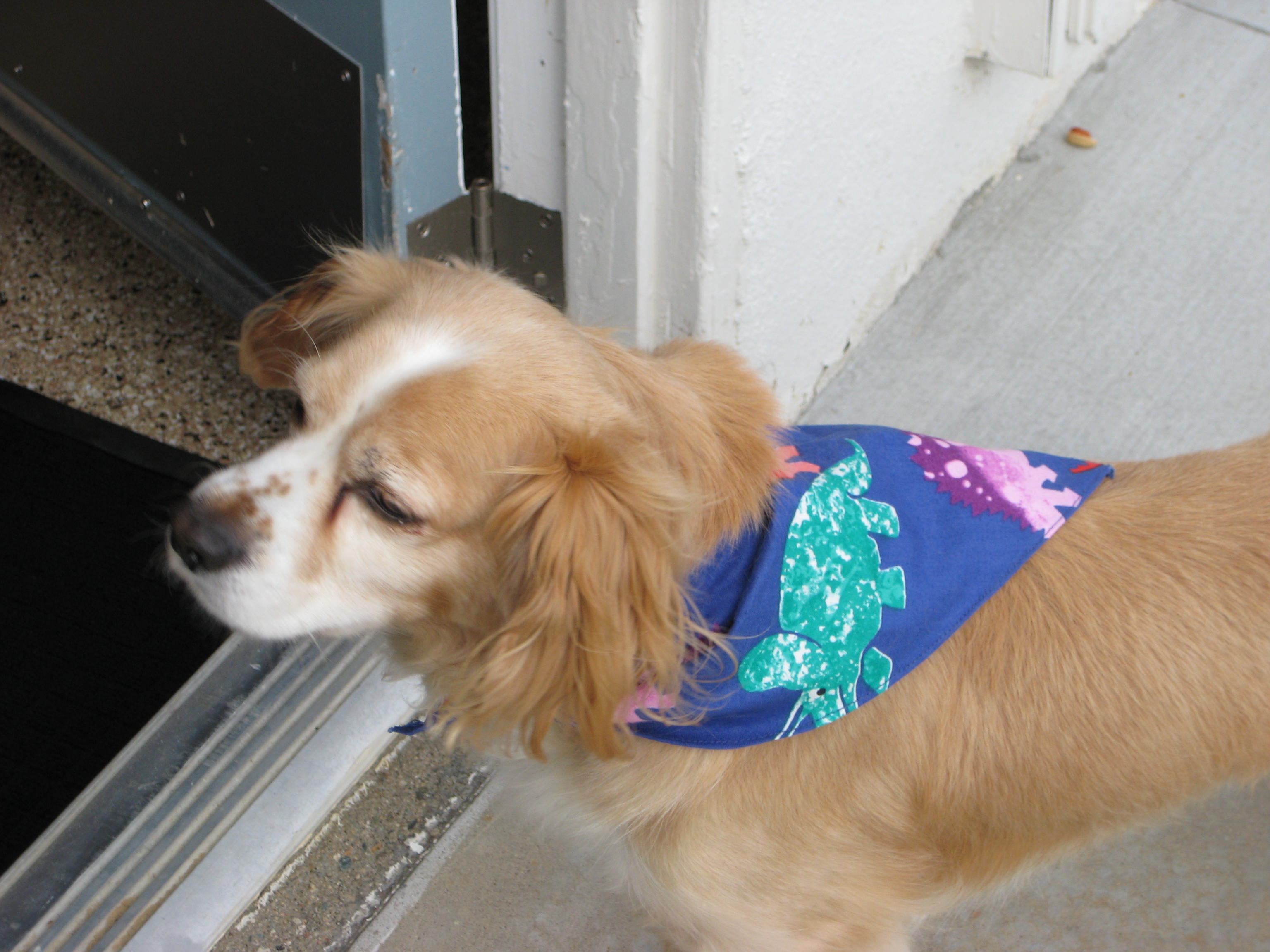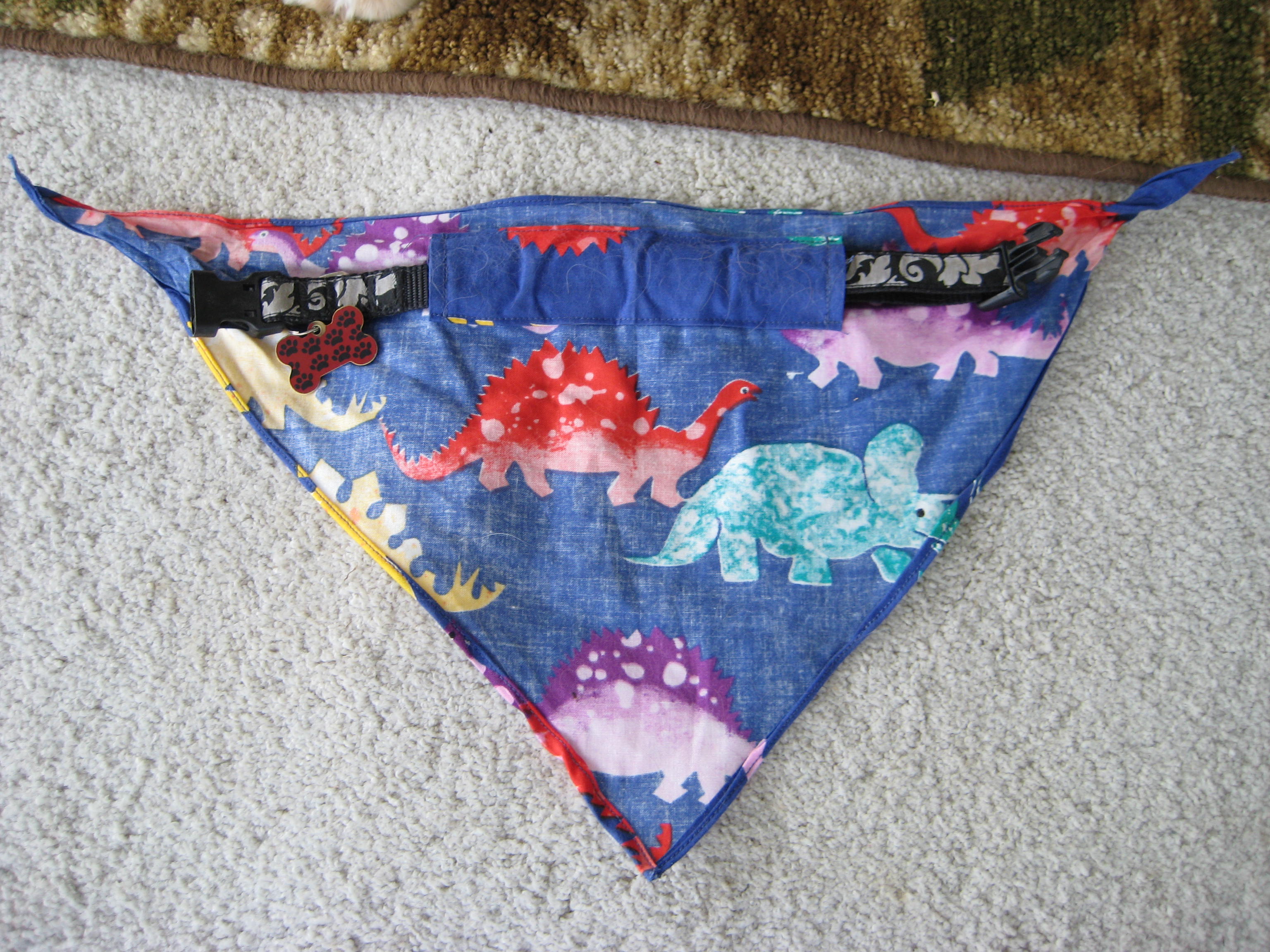 I made our pupster (don’t get me wrong he is seven years old) a new bandana/scarf/handkerchief thingy. I know, you are saying “big deal anyone can cut a triangle”. Let me clarify