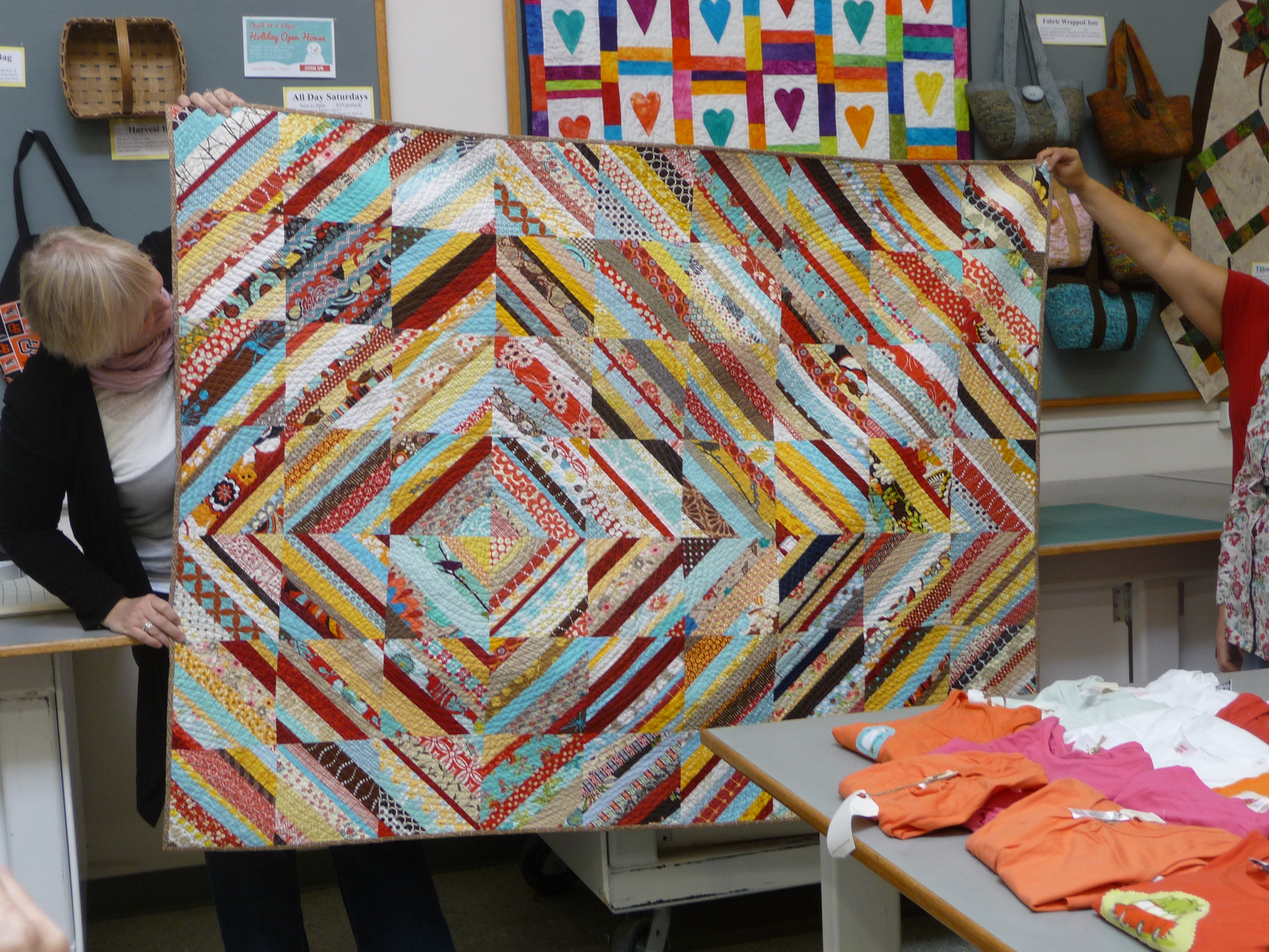 As I have mentioned before I am a proud member of the San Diego Modern Quilt Guild. Not that my quilts are all modern but I love the way they hold a meeting. We have the general agenda where announcements are made, the new bee block is revealed and whatever else needs to be said. Then there is the sharing, always awesome. Usually we have a demo of a technique after that and then we sew together for hours. It’s a great day.